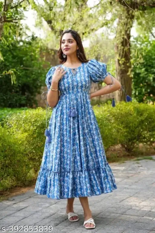 This beautiful blue floral dress features soft puff sleeves and a flared hem, giving it a graceful silhouette. Moreover, the lightweight fabric ensures comfort, while the tassel detailing adds a playful charm. Overall, it’s a perfect choice for both casual outings and relaxed gatherings.