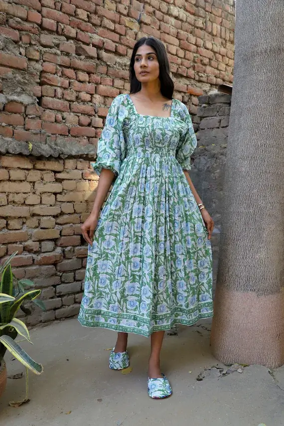 This charming green floral midi dress exudes freshness and grace. Moreover, its puff sleeves and flowy tiers add a delightful feminine touch. Additionally, the lightweight fabric ensures all-day comfort, making it perfect for both casual outings and special gatherings. Overall, it’s a stylish pick that beautifully combines comfort and elegance.